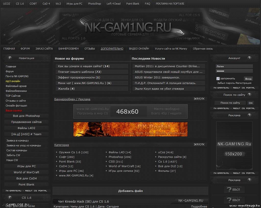 Хочу обрадовать вас, мы всё таки достали этот шаблон! Да да это Оригинал Nk-Gam1ng.RU. И это не фейк, в архиве вы найдёте все PSD, все скрипты, модули и т.д. Модули: Видео онлайн, Файлы, Пользователи, Онлайн mp3 для uCoz. Скрипты: Мини-профиль, ajax окна, ЛС в ajax окне, меню, Вид файлов, новостей, форума, Помощник в ajax, Копирайт в ajax, Увеличение картинок.